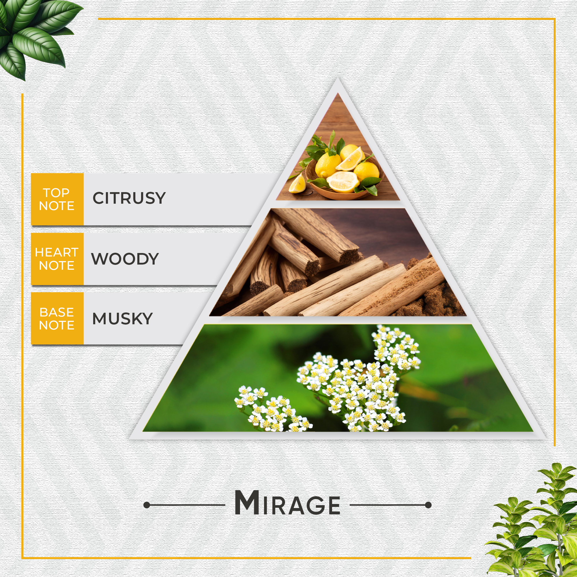 Ideal for both men and women who enjoy bold yet elegant scents, Mirage perfectly balances invigorating citrus top notes with grounding woody heart and base notes, finished with a smooth musk trail.